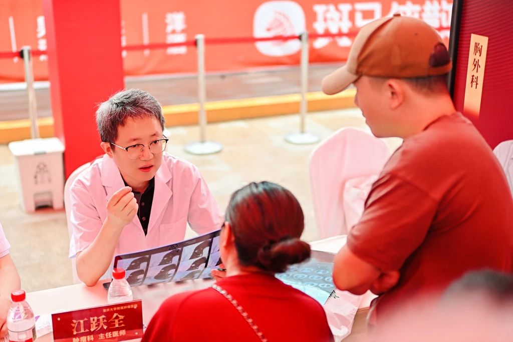 义诊现场,江跃全教授耐心接待每一位患者,认真倾听、仔细查看,尽力解答疑问。他遇到一位肺癌术后焦虑的70岁患者,全面地分析病情,打消疑虑和困惑。“指标略有波动是正常现象,半年复查一次即可。”江跃全耐心解释。
