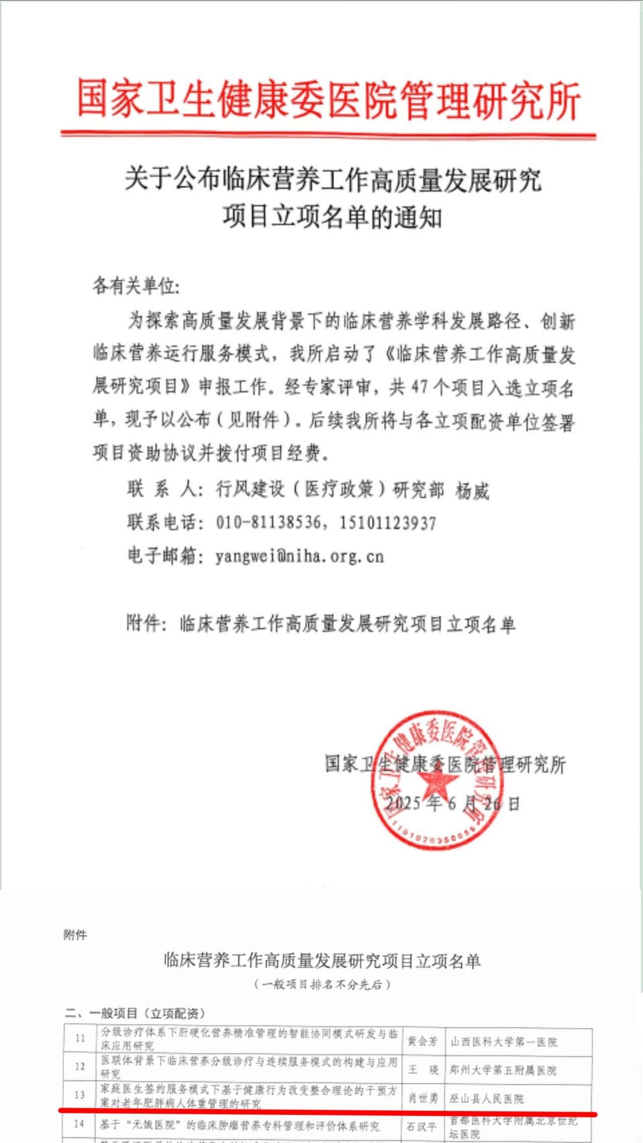 巫山县人民医院肖世勇《家庭医生签约服务模式下基于健康行为改变整合理论的干预方案对老年肥胖病人体重管理的研究》成功获批国家卫健委医院管理研究所“临床营养工作高质量发展研究项目”立项。