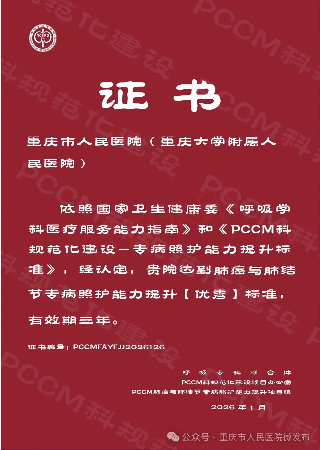 近日,规范化建设及专病照护能力提升项目认定结果正式公布,重庆市人民医院(重庆大学附属人民医院)凭借规范的诊疗体系、突出的专业能力以及优质的专科体系建设,经过项目组严格评审,成功获评“肺癌与肺结节专病照护能力优秀单位”。