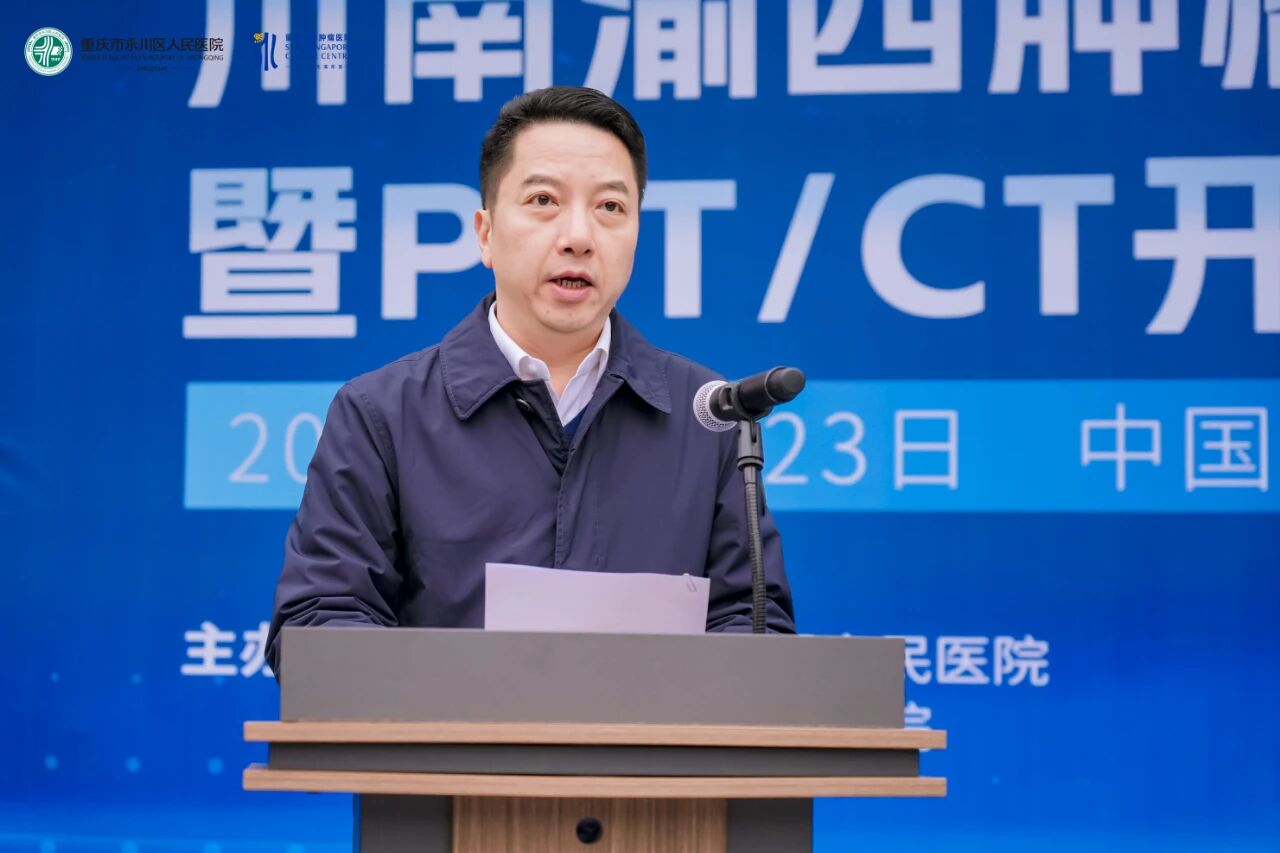 重庆市商务委党组成员、副主任、重庆市中新示范项目管理局副局长孙熙勇,重庆市卫生健康委副主任邢雅翕,永川区人民政府副区长宋朝均出席会议并讲话。重庆市中新示范项目管理局信息通信处处长马九鹏,永川区卫生健康委党委书记魏寿和,永川区商务委党组书记、主任周萍,陆军军医大学第一附属医院核医学科主任黄定德,重庆大学附属肿瘤医院核医学科主任陈晓良,东软医疗分子影像事业部总经理马健,新方代表、重庆中新肿瘤医院理事、财务总监林昌骏,永川区人民医院党委班子成员参加会议。开机仪式由永川区人民医院党委书记黄德彬主持。