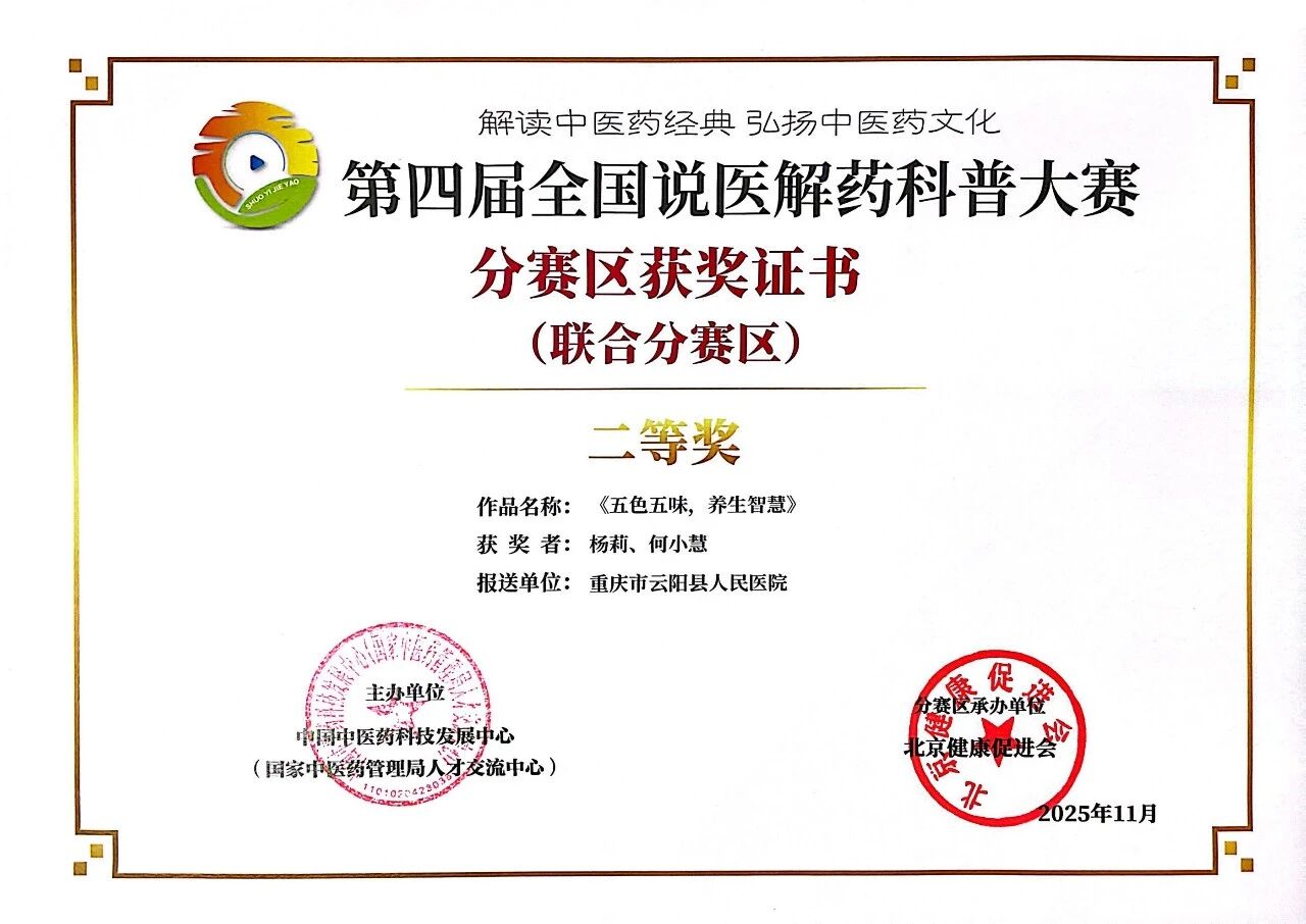 11月27 日,主治医师杨莉与中医科何小慧主任的作品《五色五味,营养均衡》在第四届全国说医解药科普大赛中荣获二等奖。
