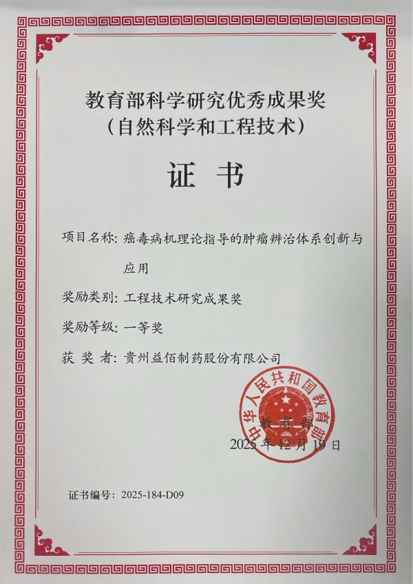 近日,贵州益佰制药股份有限公司中医药抗肿瘤领域重大科研项目《中医肿瘤癌毒病机辨治体系的构建与应用》,继2024年荣获中华中医药学会科学技术奖一等奖后,于2025年再度斩获教育部科学研究优秀成果奖(自然科学和工程技术)一等奖。一年之内,同一成果接连摘得我国中医药行业最高专业奖与教育部最高科技奖,彰显其在理论创新、临床转化与产业化应用上的卓越价值。
