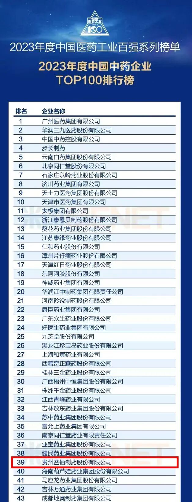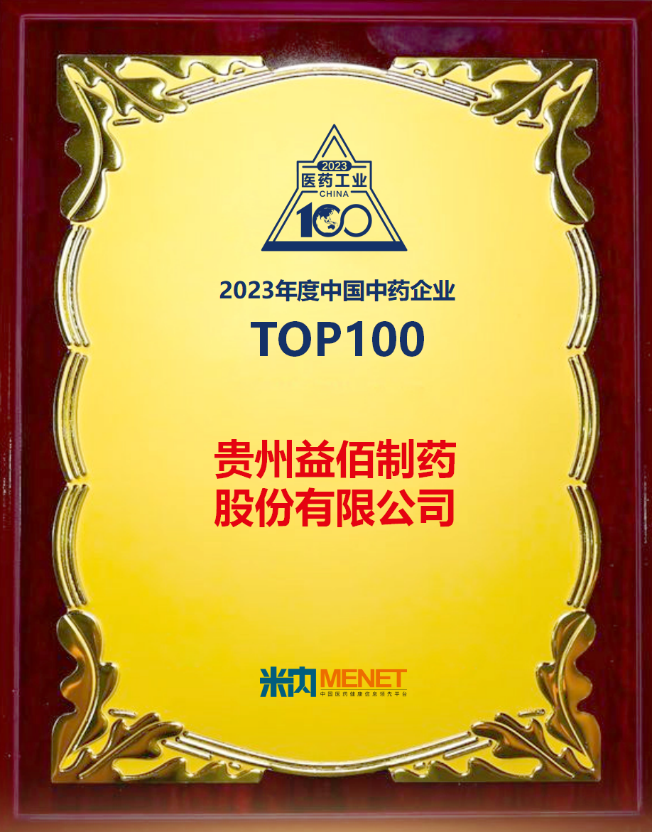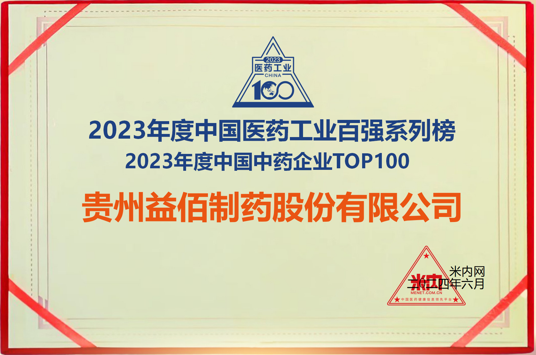 贵州益佰制药股份有限公司凭借扎实的研发生产实力和稳健的市场推广能力,以新质生产力推动高质量发展,成功入选“2023年度中国中药企业TOP100”,位列39名;已连续19年入选中国医药工业百强榜。