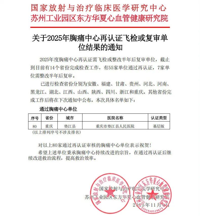 近日,国家放射与治疗临床医学研究中心、苏州工业园区东方华夏心血管健康研究院联合发布《关于2025年胸痛中心再认证飞检或复审单位结果的通知》,重庆市垫江县人民医院顺利通过国家级胸痛中心再认证,这标志着我院在急性胸痛疾病诊疗水平、多学科协作能力及区域急救体系建设方面迈上新台阶,为保障县域及周边群众生命健康筑牢了“心”防线。