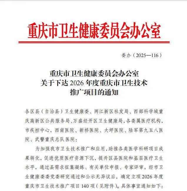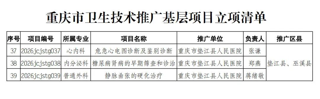 为配合实施医疗卫生强基工程,促进我市卫生技术推广和应用,按照重庆市卫生技术推广项目管理规定,市卫生健康委在近期组织开展了2026年度重庆市卫生技术推广项目立项工作,并发布于《关于下达2026年度重庆市卫生技术推广项目的通知》,确定立项140项。其中,重庆市垫江县人民医院申报的三项卫生技术获准立项。