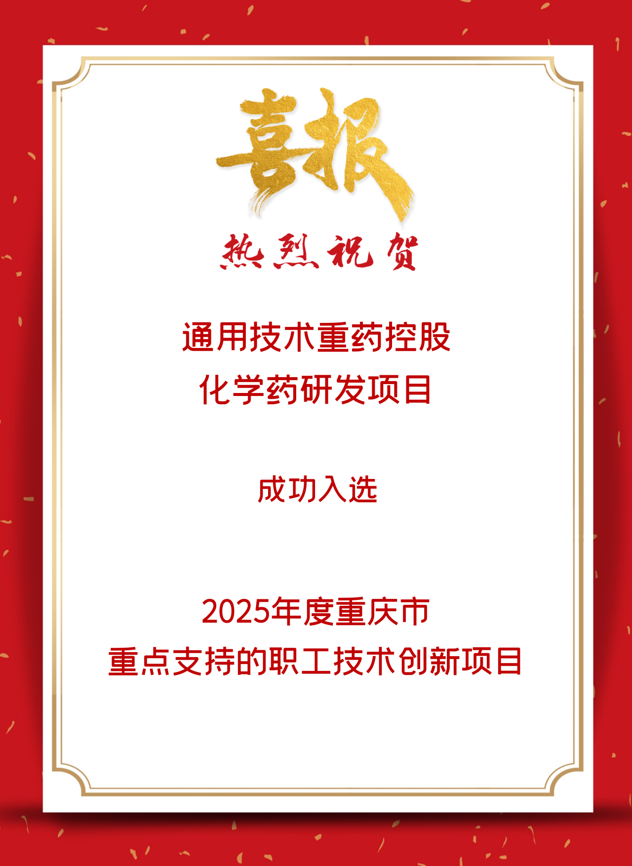 近日,重庆市总工会正式发布《关于2025年度重点支持的职工技术创新项目的通知》,通用技术重药控股申报的化学药研发项目成功入选“2025年度重庆市重点支持的职工技术创新项目”。